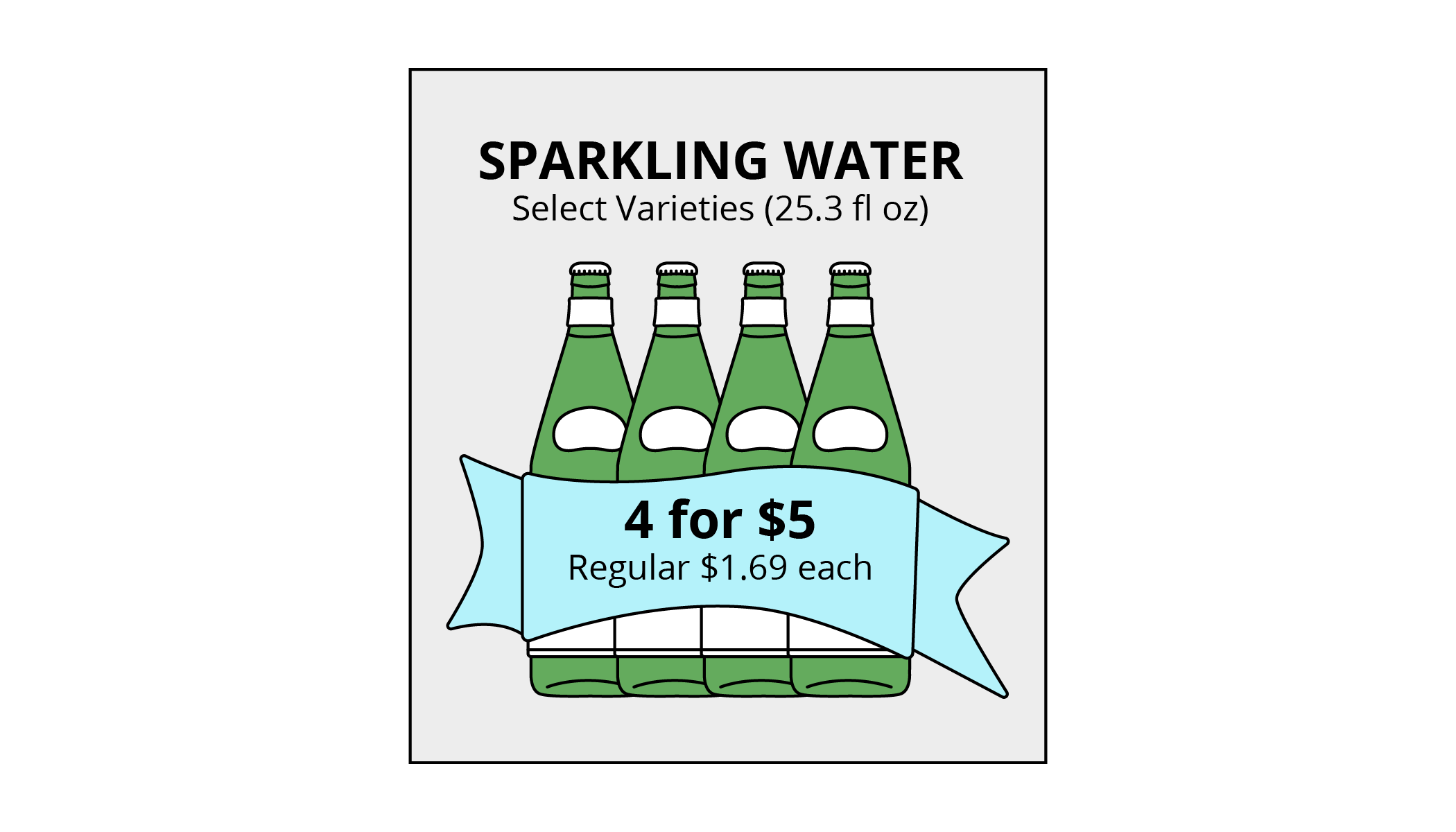 Bottles of sparkling water usually cost $1.69 each. This week they are on sale for 4 for $5. You bought one last week and one this week. Did you pay more or less for the bottle this week? How much more or less?