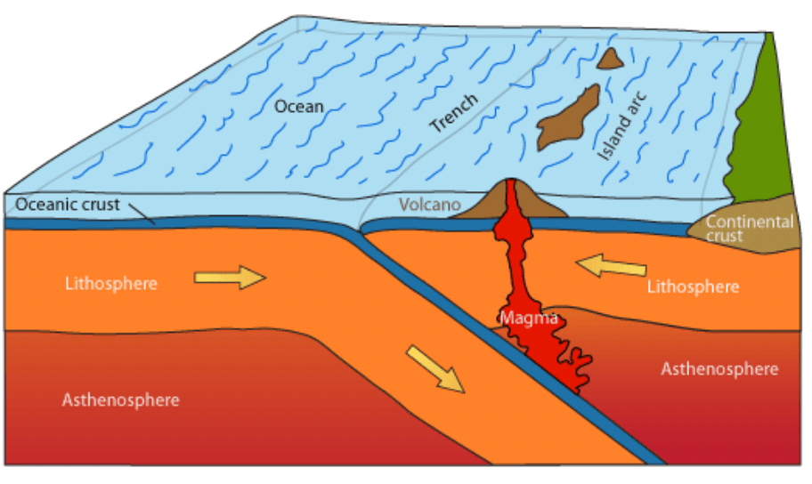 What 3 things happen when an oceanic plate converges with another oceanic plate?
