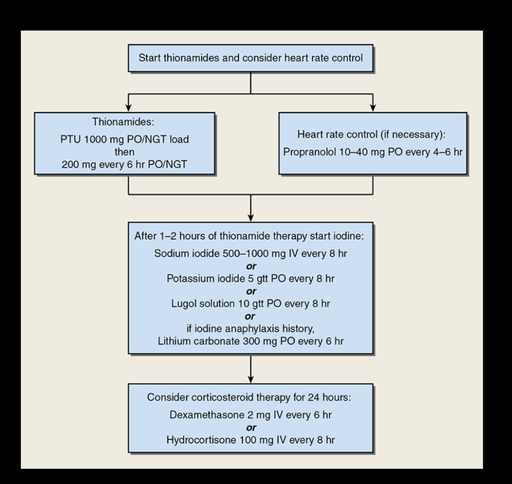 Give iodine and corticosteroid to inhibit peripheral conversion of T3 to T4. If iodine allergy, use lithium carbonate.