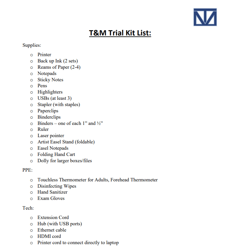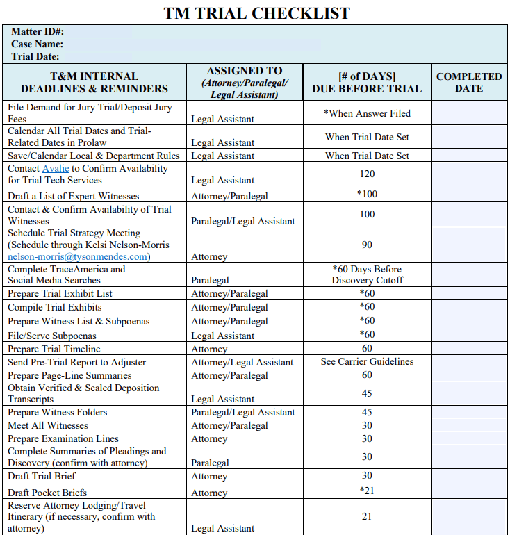A team going to trial will use this document to calculate/track non court-related deadlines for trial preparation.