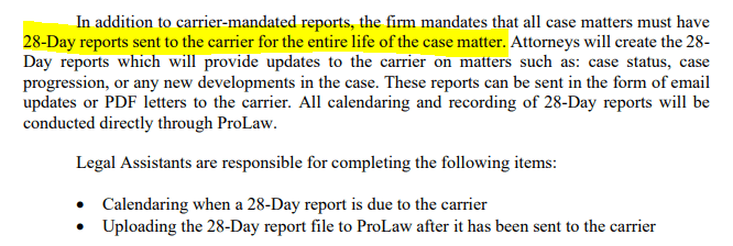 This is the number of days every matter should be reported on from the attorney to the adjuster.