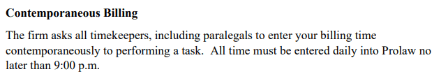 This firm practice for timekeepers requires them to bill for time within the same time period that the work was completed for the matter.