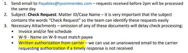 When sending a check request to Payables, the Legal Assistant will include the invoice, W-9 form, and __________.