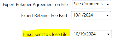 This "date field" must be filled out when a closing email is sent to an Expert/Vendor.