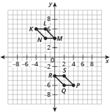 Parallelogram KLMN has vertices K (-4,6), L(-2, 6), M (0,4) and N (-2, 4) Parallelogram PQRS has vertices P (4,-6), Q (2,-6), R (0,-4), and S(2,-4).
