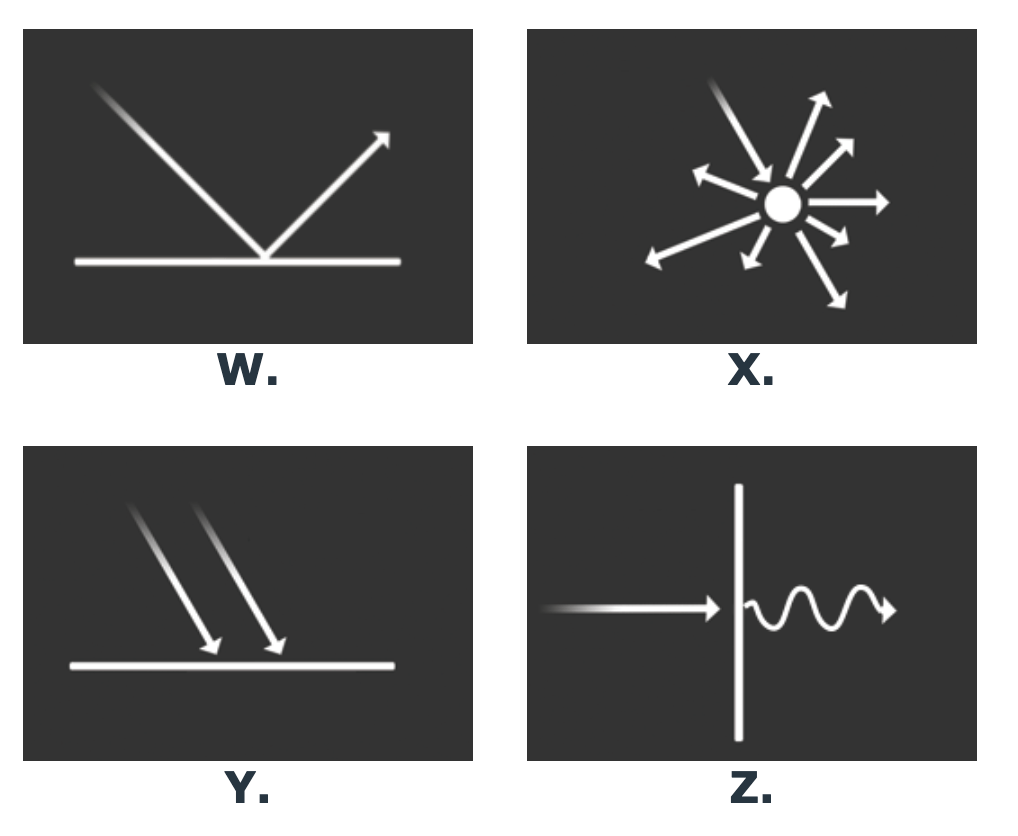 Light waves are (1)_______ when they travel through the air from the Sun to the pavement. When the waves interact with the pavement, some are (2)_______ and transfer energy to the pavement. Other waves are (3)_______ and change direction.