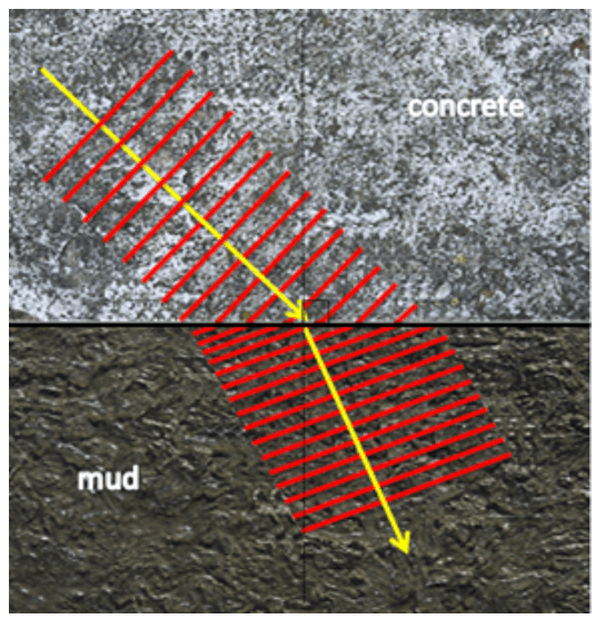 What happens to the sound wave when it passes from the concrete into the mud? Its direction and ______ changes.