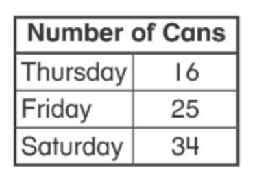 Willie collects cans to be recycled. The table shows the number of cans he has collected. How many fewer cans did Willie collect on Thursday than on Saturday ?