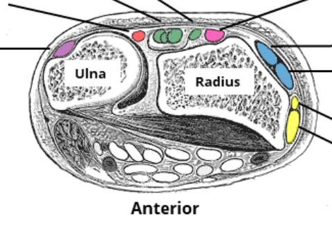 22F with stab would to R hand. Please describe exam and the 2 injured structures seen in the exam? What is the treatment?