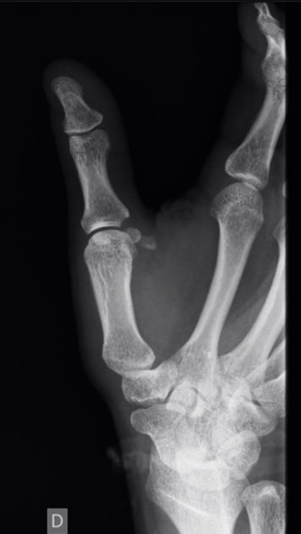 Fall onto his right hand, with pressure on the thumb and index fingers resulting in metacarpophalangeal pain, swelling and functional limitation.