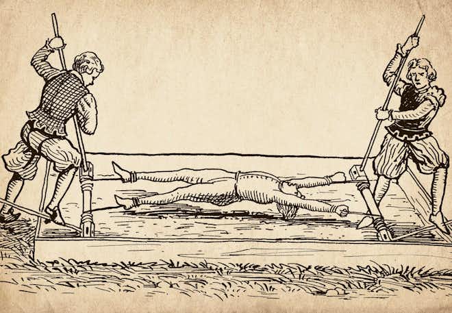 "Først blev den dømte pint med gloende tænger, derefter fik vedkommende hugget sin højre hånd af, for så at blive halshugget. Derefter blev kroppen radbrækket og lagt på hjul og stejle, mens hovedet og hånden blev sat på stejle"