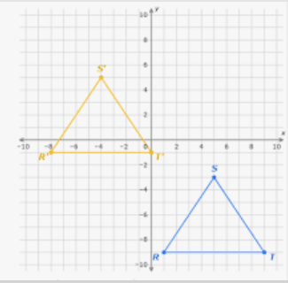 Ignore the yellow figure. What will be the coordinate of R' after translating the blue triangle up 7, right 9?