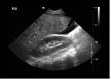 This positive finding on the FAST exam in the right upper quadrant indicates the presence of this.