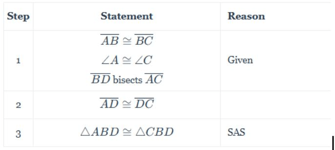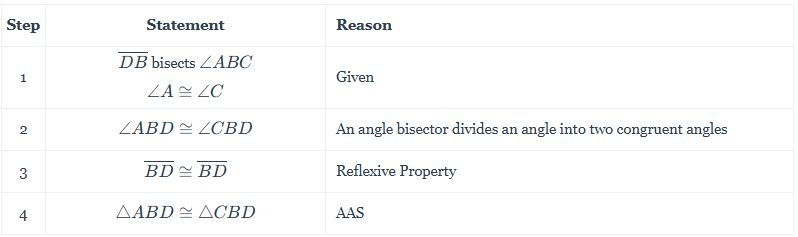 Given that segment DB bisects angle ABC and angle A is congruent to angle C, this is a two column proof that justifies that triangle ADB is congruent to triangle CDB.