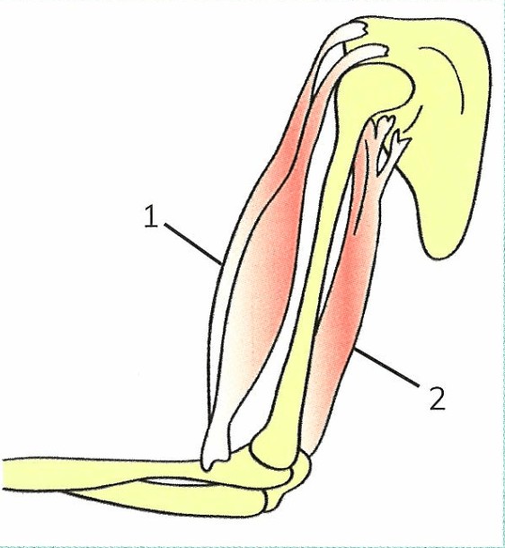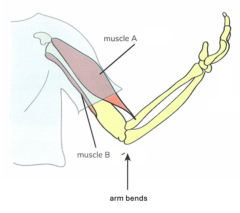 Choose the correct words in the sentences to explain how muscle A makes the arm bend upwards.