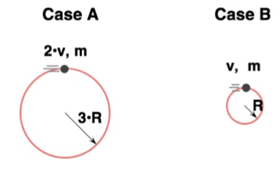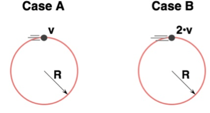 THe speed in case B is twice that of A, the radius is the same. How does the acceleration of Case A compare to that of B?