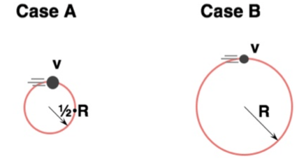 The circle's radius in A is one half that of B, the velocity is the same. How does the acceleration of Case A compare to that of B?