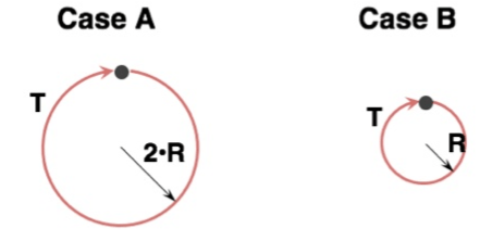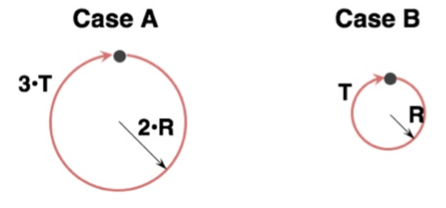 The radius in case A is twice that of case B, the period is the same. How does the speed of case A compare to that of case B?