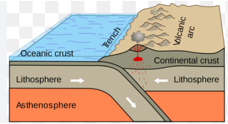 What happens at convergent boundaries between oceanic and a continental plates?