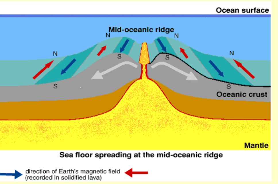 Seafloor spreading! Magma rises up to fill in the gap and usually forms long underwater mountain chains (ridges and rises)