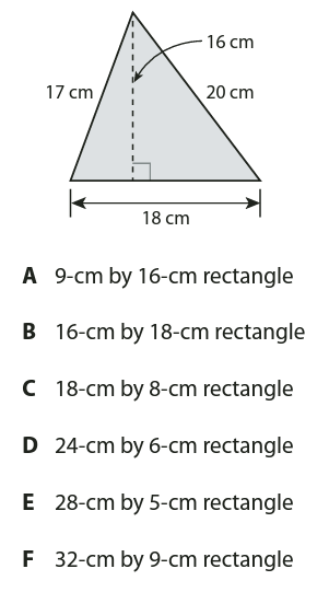 After finding the area of the triangle below, which rectangular dimensions with the given dimensions will have the same area in centimeters squared?