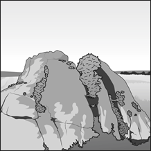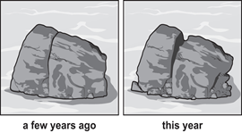 Water seeped into the rock and froze, causing the rock to break farther apart. This occurred many times.