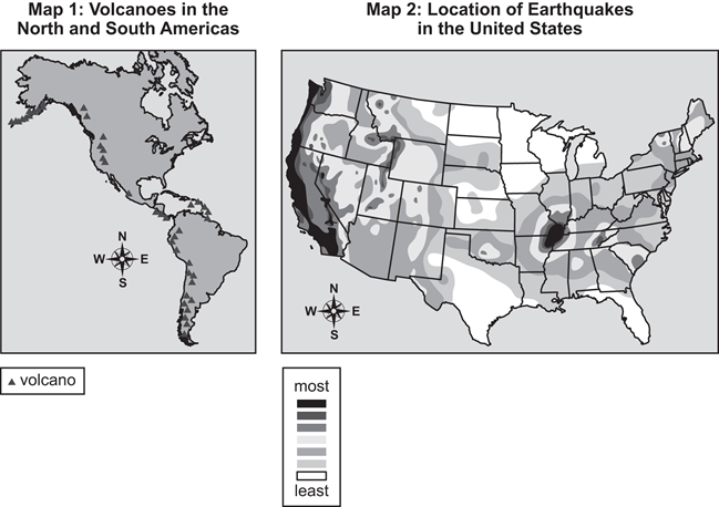 Map 1 shows where volcanoes are in North and South America. Map 2 shows the location of Earthquakes in the U.S.