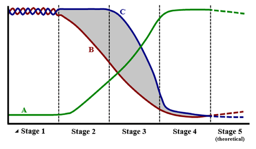 It is characterized by relatively low growth rates at stage 1 and stage 4.