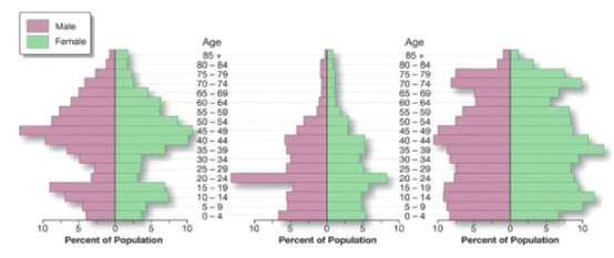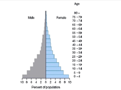 Each of the three population pyramids (below. are census tracts from St. Louis County in northern Minnesota, that stretches from Duluth to Canada. The population pyramid on the left most likely represents: