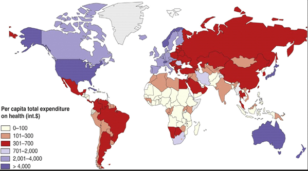 Countries shown below with higher per capita total expenditure on health are primarily:
