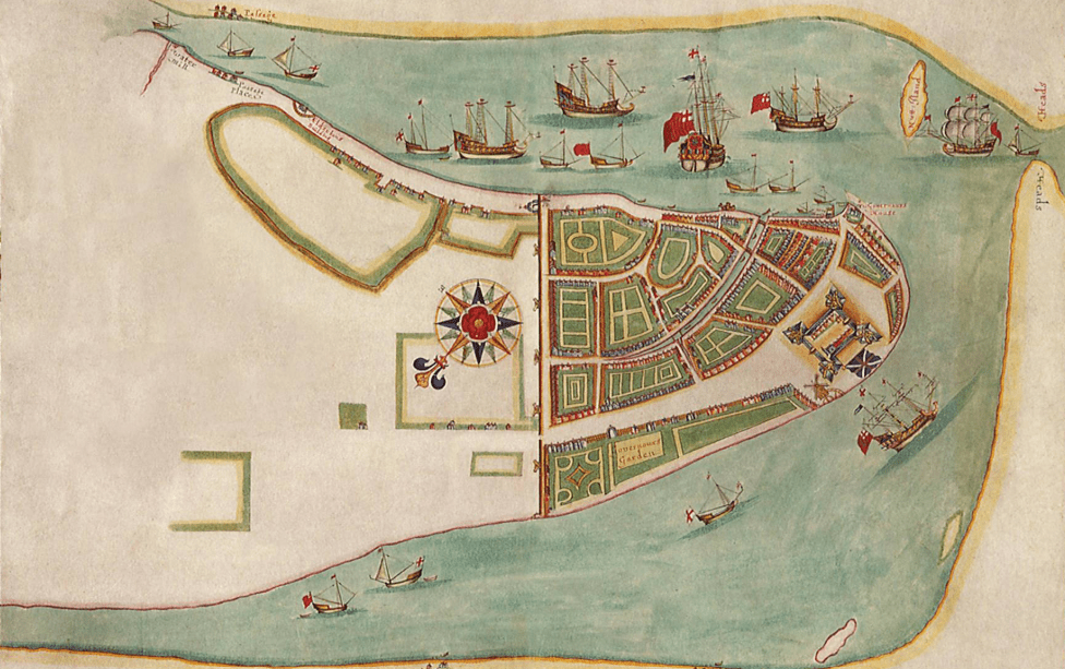 The image below depicts New York Harbor in 1664.