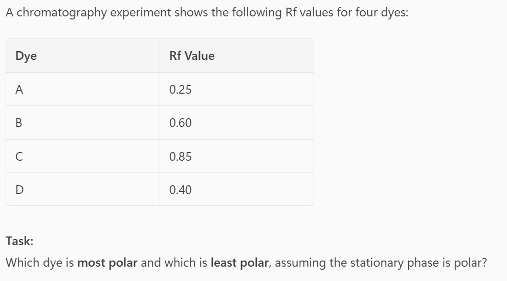 • Most polar → Dye A (lowest Rf, sticks to polar stationary phase)