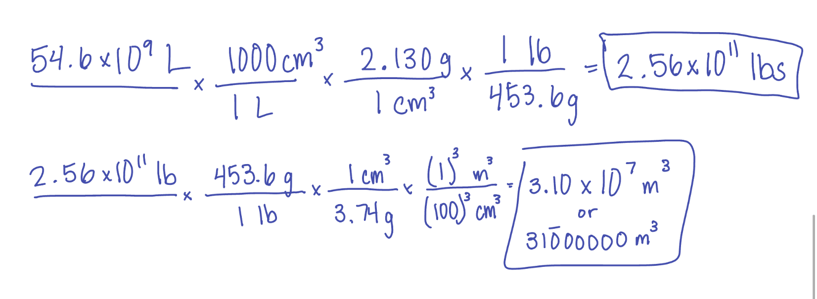 The annual production of sodium hydroxide (NaOH) in the United States in 2019 was 54.6 billion liters. How pounds of sodium hydroxide are produced? (density of sodium hydroxide is 2.130 g/cm3).