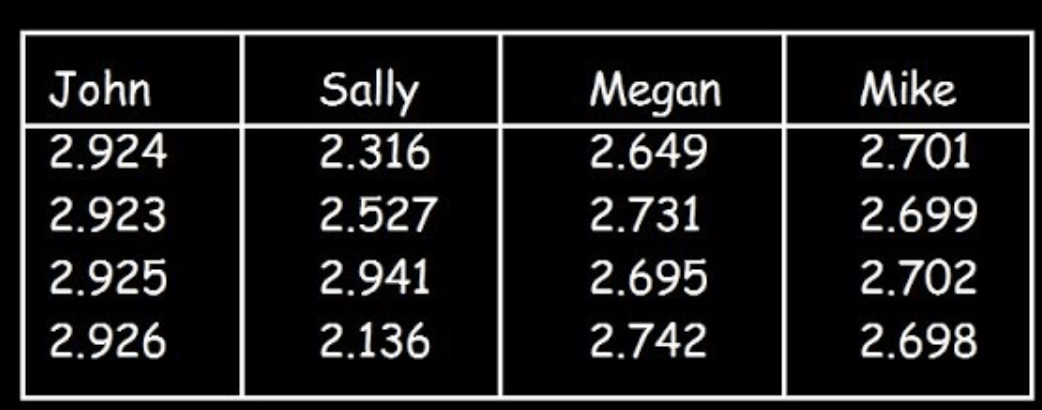 Four students measured the density of aluminum (2.70 g/cm3). Which student was accurate & precise? Which student was the neither accurate nor precise? Calculate John's % Error