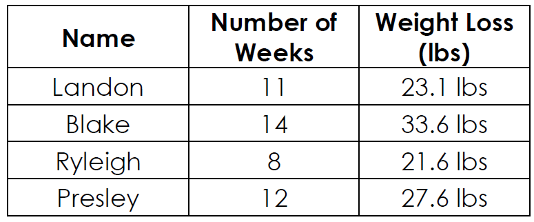 The table shows the weight loss of four people during various durations of time. Who has lost the most weight per week?