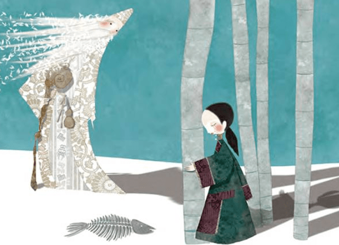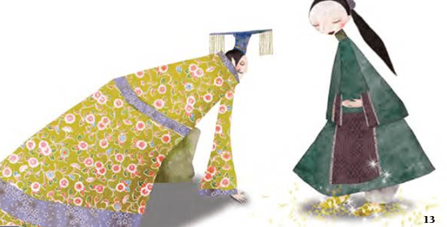Look at the picture. What does Yeh-Shen use to wish for a beautiful dress?