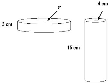 These two cylinders have the same volume. What is the value of r of the smaller cylinder? Hint: find the volume of the tall cylinder first.