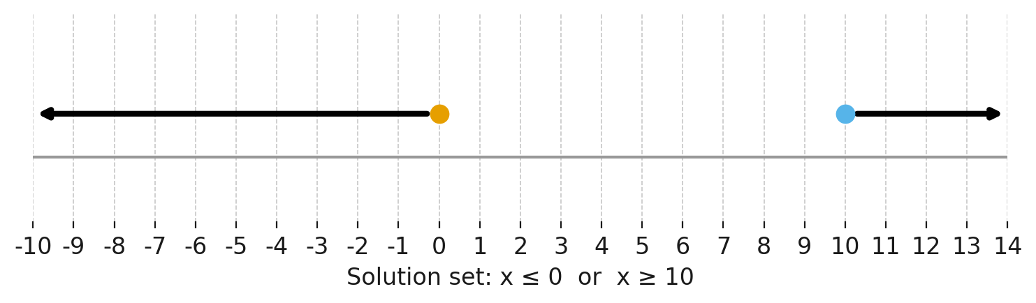 x≤0 or x≥10, (−∞,0] or [10, ∞)