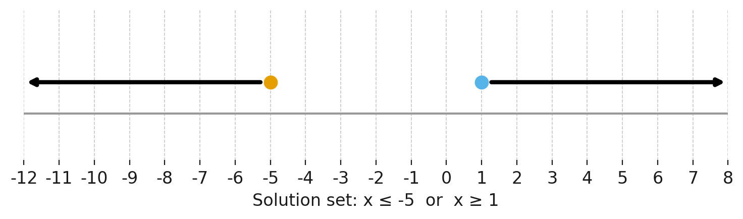 x≤−5 or x≥1, (−∞,−5] or [1,∞)