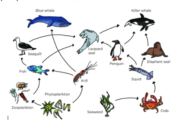 phytoplankton -->zooplankton->fish->seagull->leopard seal