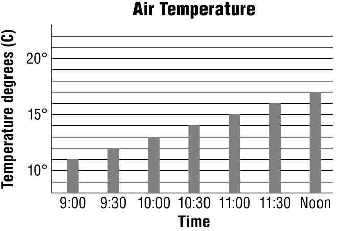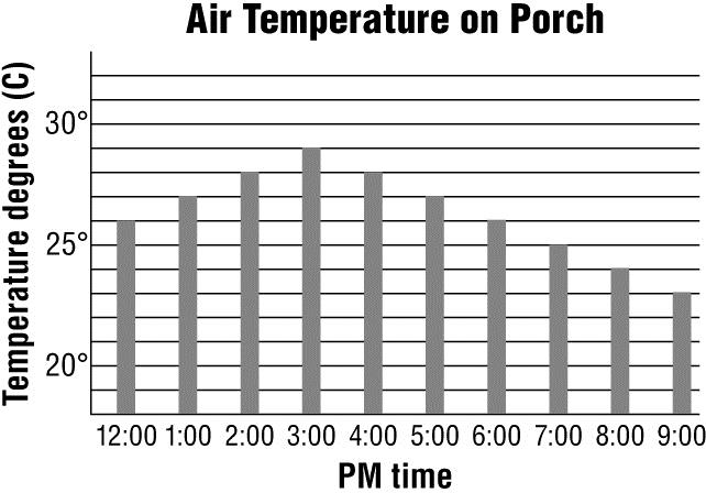 A thermometer on Sam’s porch is always in the shade. Sam checks the temperature each hour from noon until bedtime. Then he draws the bar graph shown below.