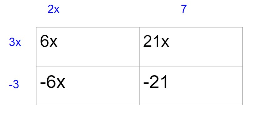 True or false: When multiplying (3x - 3)(2x + 7) and using the area model, the following shows the correct information: