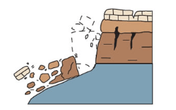 flowing water wearing away little bits at a time OR water getting into rock cracks and then freezing, thawing and freezing again