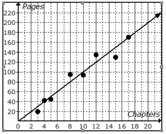 The scatterplot shows the relationship between the number of chapters and the total number of pages for several books. Use the line of best fit to predict how many chapters would be in a book with 180 pages.