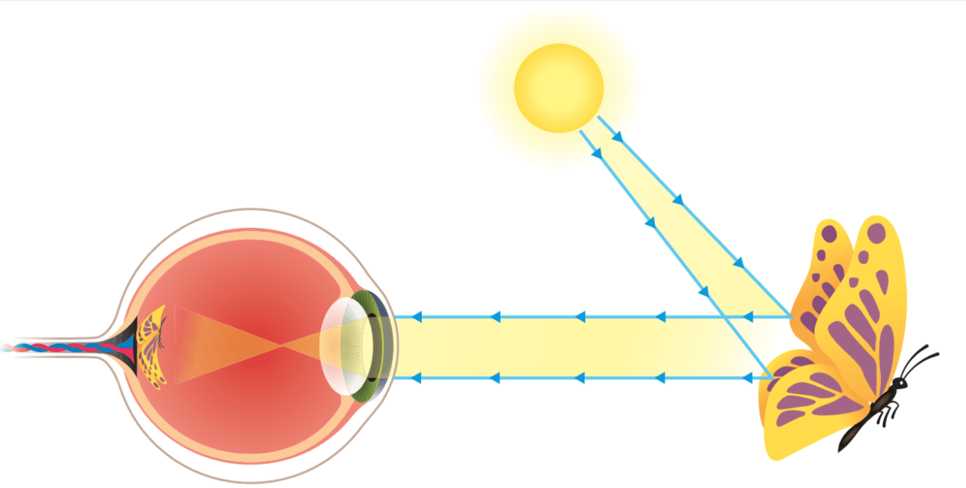 When you look at a butterfly, light from the Sun reflects off the butterfly and enters your eyes. The light enters the surface of your eye. The ______ allows you to focus on what the light is reflecting and then sends a message to the ________.
