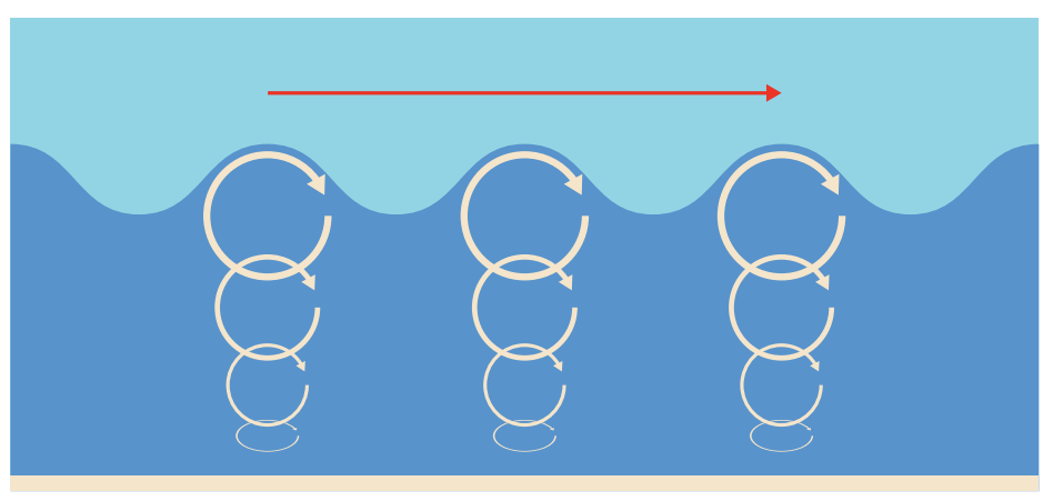 The wave energy moves _______, but the water itself only moves _____ and ______ in place.