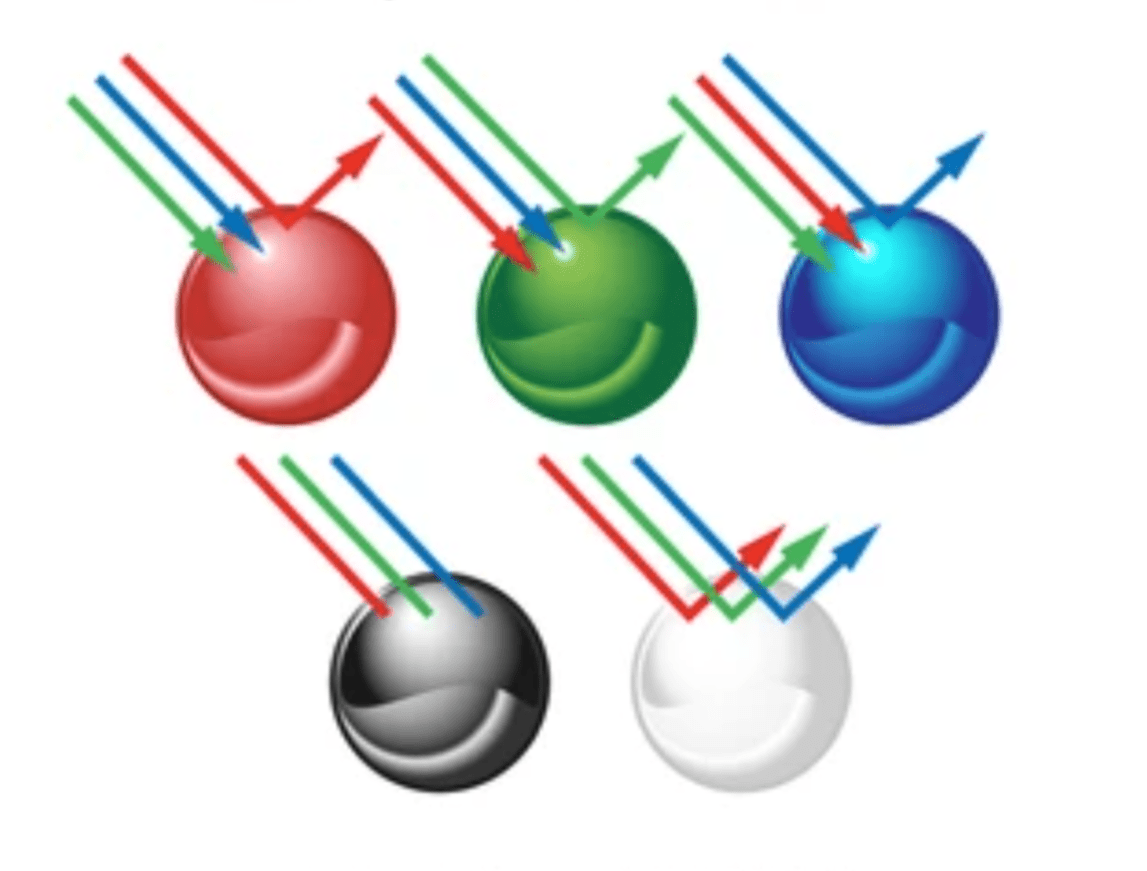Each color of the rainbow has a different wavelength. When light hits the red ball, you see it as red because it reflects the red wavelengths. When light hits the white ball, it reflects all wavelengths. When light hits the black ball, it does this.