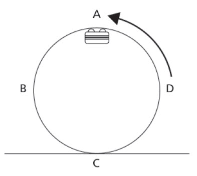A 50-kg student riding in the coaster car is sitting on a bathroom scale when the car is in position A. The circle has a radius of 8 m, and the car’s velocity at point A is 10 m/s. What would be the reading on the bathroom scale when the student and car are at point A?