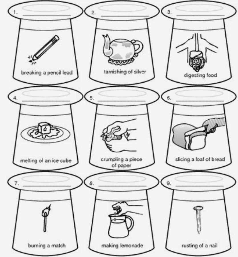 Melting, Freezing, Condensing, Vaporizing, Sublimation, Deposition.