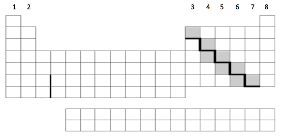 Metals to the left of the stair stepper (most of the periodic table), metalloids are shaded, and nonmetals are to the left